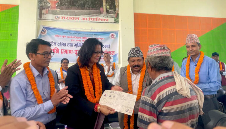 मेरो कार्यकाल भित्रै भूमिहीनहरूको समस्या समाधान गर्ने गरी काम गरिरहेको छु ।’ भूमि व्यवस्था, सहकारी तथा गरिबी निवारण मन्त्री रन्जिता श्रेष्ठ चौधरीले सरावल गाउँपालिका वडा नं ३ का २५ भूमिहीन सुकुम्वासी परिवारलाई जग्गाधनी लालपुर्जा प्रदान गरिन् । लामो समयको प्रतीक्षा पछि नवलपरासीको (पश्चिम) सराबल गाउँपालिकाका २५ परिवारले पुर्जा पाएका हुन ।